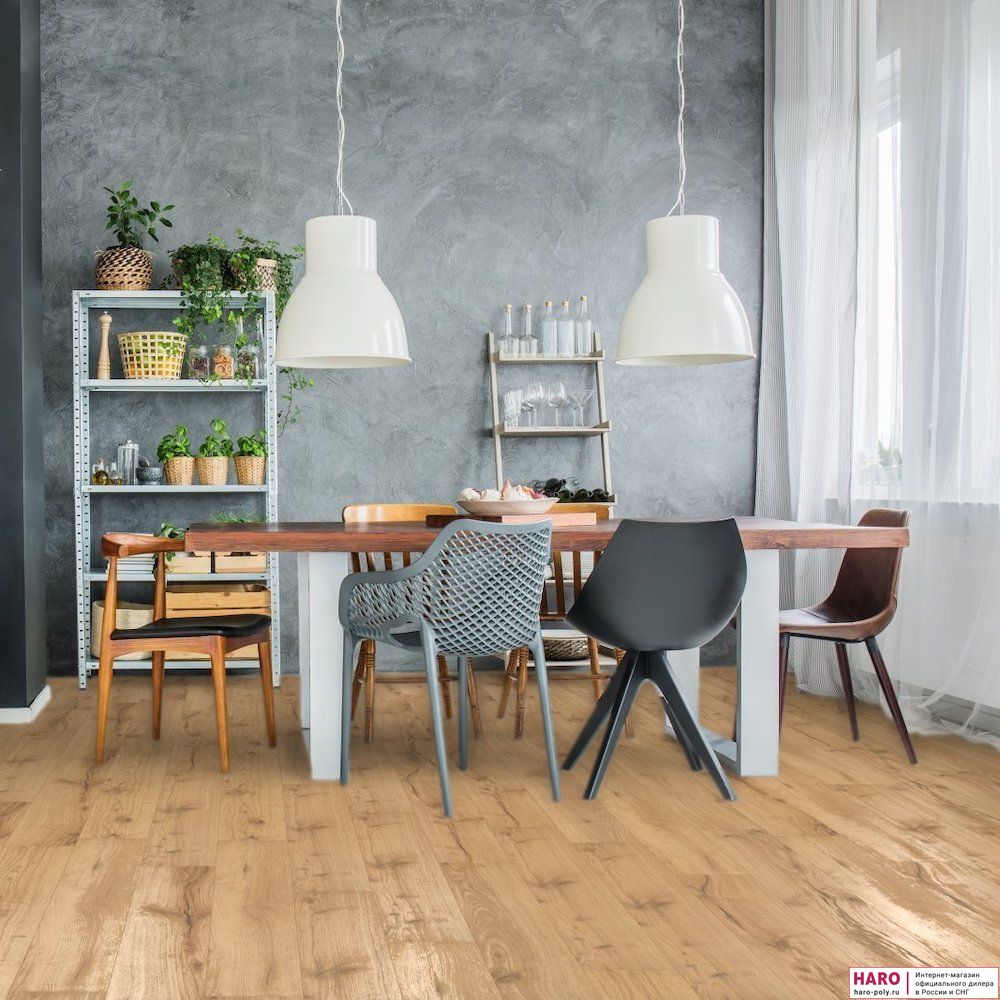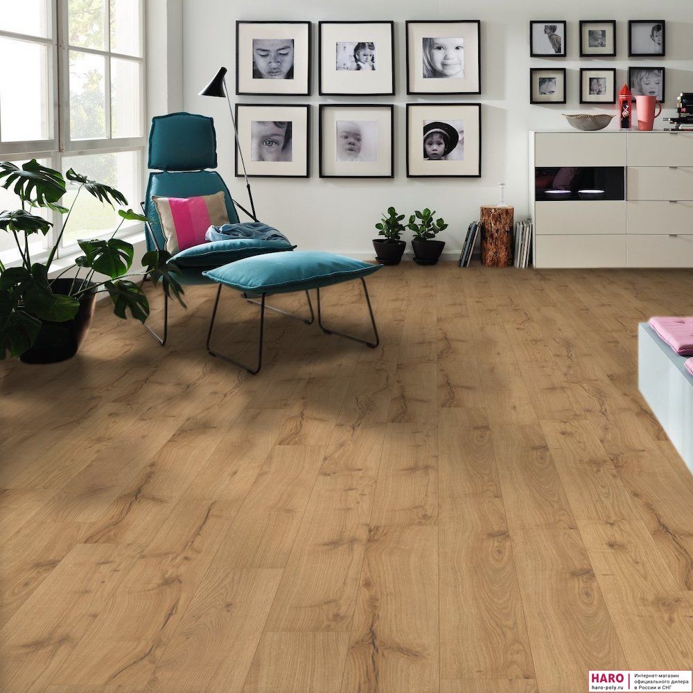 Ламинат HARO отлично подходит для теплого пола водяного или электрического типа. Прочная поверхность и замки 5-го поколения Топ Коннект легко выдерживают повседневные нагрузки и тяжелую мебель. Укладка ламинатной доски происходит очень быстро и просто с помощью пластиковой защелки в замке. С помощью дополнительного крепежа ламинат можно монтировать и на стены.