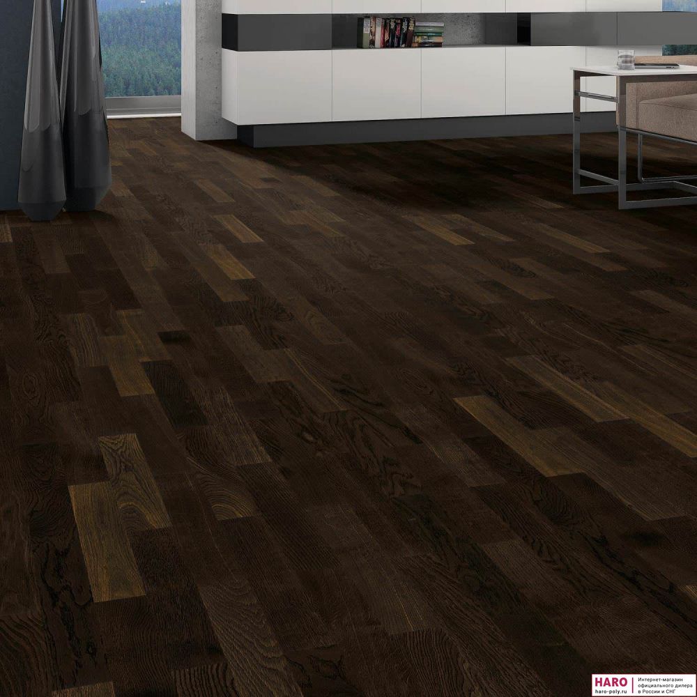 Инженерная доска HARO Allegro 4000 имеет двухслойную конструкцию. Верхний слой выполнен из отборного дуба в черной тонировке, а в основании - древесина сосны. Конструкция зарекомендовала себя как стабильная и надежная. Доски сохраняют свою форму даже при перепадах температуры и влажности.