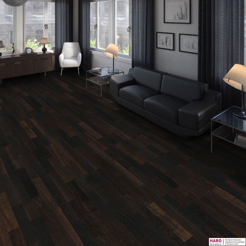 Инженерная доска HARO Allegro 4000 имеет двухслойную конструкцию. Верхний слой выполнен из отборного дуба в черной тонировке, а в основании - древесина сосны. Конструкция зарекомендовала себя как стабильная и надежная. Доски сохраняют свою форму даже при перепадах температуры и влажности.